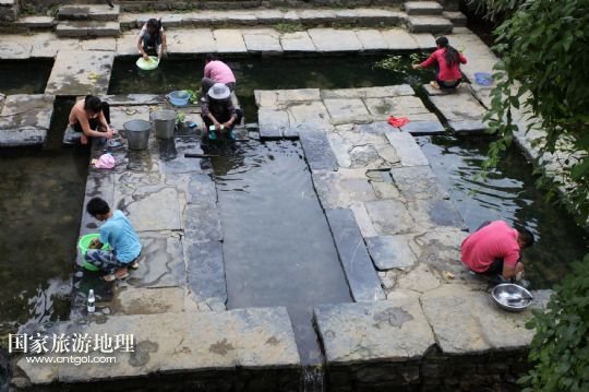 9月26日,在廣西昭平縣黃姚古鎮(zhèn),人們?cè)谝豢诠啪韵床?、洗衣服?/p>