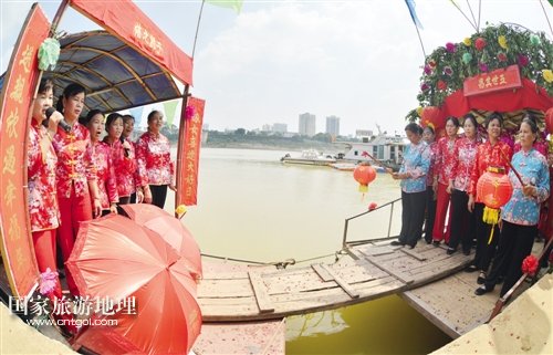 國家旅游地理 廣西南寧10月3日訊(記者 龍博 實習生 雷麗軍/文 記者 段柳健/圖) 金秋十月的邕江河畔,秋高氣爽,碧水粼粼。昨日,從南寧港的江邊傳來陣陣漁歌與歡喜的嗩吶聲,原來,水上人家周木蘭家在這一天嫁女,一場古樸而傳統(tǒng)的水上婚禮儀式正在邕江岸邊拉開序幕。隨著水上人家的上岸,這樣的傳統(tǒng)婚俗儀式越來越少見,而獨特且略顯神秘的婚俗也吸引了四面八方過來湊熱鬧的人們。