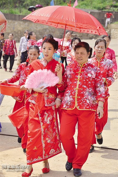 “五世其昌”的祝福對聯(lián),大紅的喜慶燈籠,插滿青草與鮮花的漁船顯得古樸而富有情調(diào)。而岸上的儀式也頗有講究:一張精心準備的圓桌,擺著一盆四季橘,一只展翅欲飛、口銜“金幣”的“鳳凰雞”,寓意飛黃騰達。一對紅燭、算盤、鏡子、糯米飯等物品,均取吉祥如意之意。迎娶新娘的時辰未到,新娘的兩位兄嫂幫她梳妝打扮,描眉盤發(fā),給發(fā)髻插上珠玉釵,換上喜氣的紅綢裙,一番梳妝打扮之后,新娘變得美艷動人。裝扮完畢,新娘邀請自家姐妹及親戚“擺歌堂”,感激父母養(yǎng)育之恩,傾訴依依惜別之情。