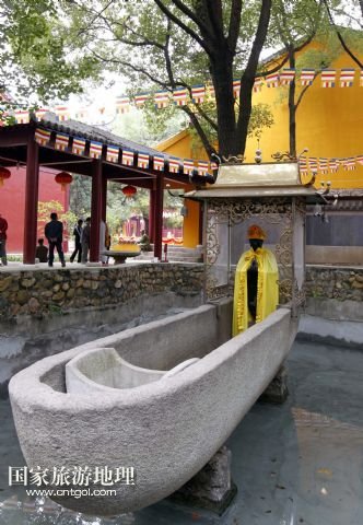 這是九江能仁禪寺內(nèi)的飛來石船。石船長一丈五、寬尺余,側(cè)面有銘記,鑿于北宋慶歷六年,石船上端坐鐵佛(10月18日攝)。
