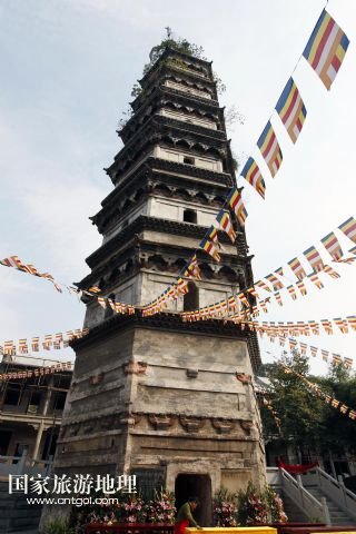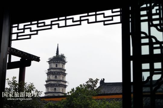 能仁禪寺中的大勝寶塔是九江市的標志,始建于唐代宗大歷元年(公元766年),明洪武十二年(公元1379年)重建。塔為磚石結(jié)構(gòu),塔高43米,分七層六面,塔內(nèi)有磚砌梯階,可盤旋而上(10月18日攝)。