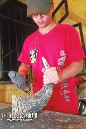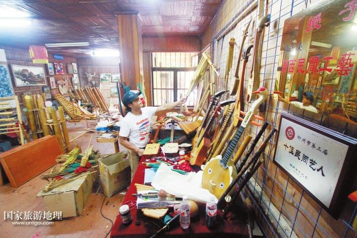 國家旅游地理 廣西柳州11月11日訊(記者陸旺楊春)  牽手漫步龍?zhí)睹琅?,并肩靠背沐浴晚秋暖陽,你會時常聽到一串串動人的音符:它時而渾厚圓潤、清脆響亮,時而輕靈縹緲、悠長凄美。不忍打破這份寂靜閑情,卻又忍不住猜想:這是何方人士,用何種樂器,吹拉彈撥出如此佳音?穿越叢林,循聲走去,瑤寨庭前,幾個年輕男女手握蘆笙,身子左搖右晃,吹得正起興。步入瑤寨一樓才發(fā)現(xiàn),這里儼然一個生產民族樂器的大工廠:木板、竹竿、鐵鋸、膠水、油漆,以及形狀酷似牛頭、牛腿、魚身、龍身等顏色各異、五花八門的樂器……一位正在給樂器上漆的中年人梁志榮告訴記者,這是龍?zhí)豆珗@正在籌建的民族樂器館,也是魚峰區(qū)創(chuàng)建廣西文化強區(qū)的特色景區(qū)之一,他現(xiàn)在是大龍?zhí)睹褡逅囆g團團長,研究、制作民族樂器將近20年,曾獲“廣西民間工藝大師”和“十佳民間藝人”稱號。