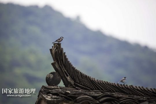 5月11日,兩只小鳥在土目源村的石屋上休憩。