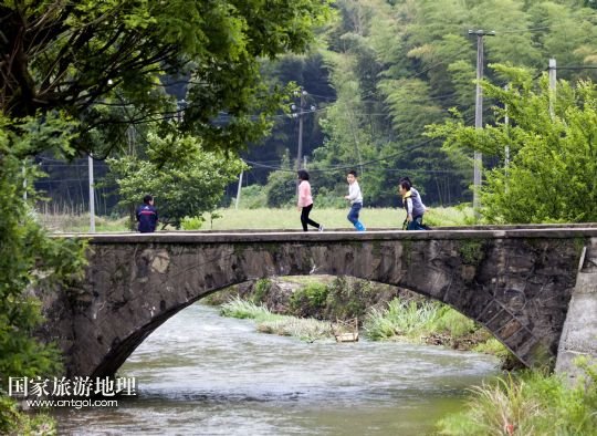 5月11日,幾名小孩從土目源村的石橋上走過(guò)。