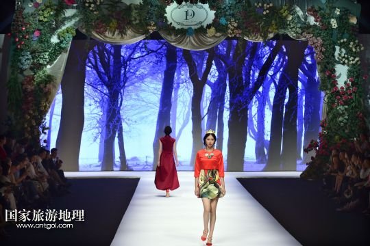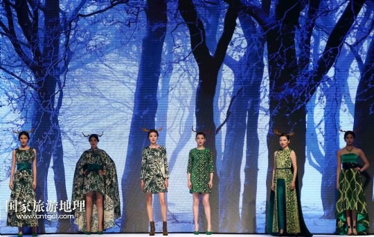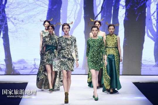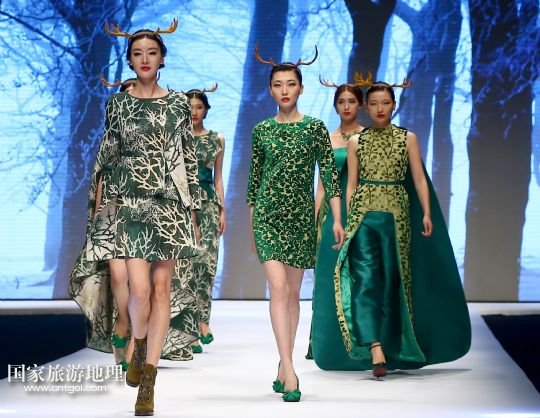 5月9日,模特在“2015杭州國際時尚周”開幕式上展示英國寶萊達(dá)服裝設(shè)計公司主題為“樹靈派對”的時裝。