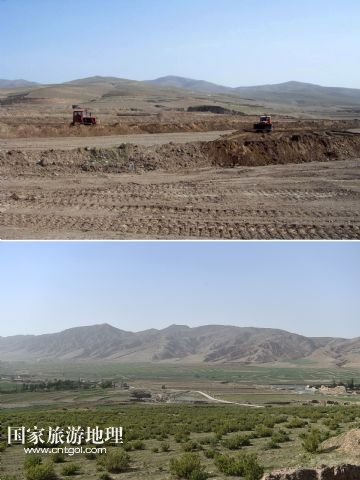 上圖上:2014年4月的資料照片上甘鹽池一片荒涼;上圖下:6月4日,記者拍攝的甘鹽池已是綠意盎然(拼版照片)。