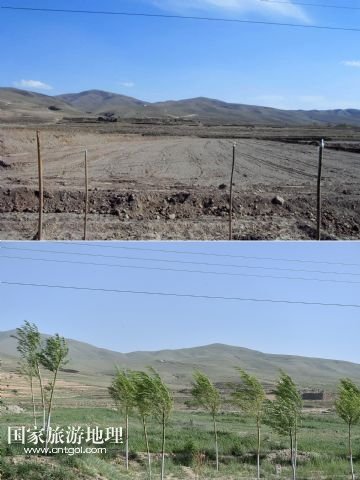 國家旅游地理 寧夏中衛(wèi)6月9日訊 上圖上:2014年5月的資料照片上甘鹽池一片荒涼;上圖下:6月4日,記者拍攝的甘鹽池已是綠意盎然(拼版照片)。寧夏海原縣甘鹽池地處黃土高原干旱帶上,平均海拔約2100米,年均降雨量在280毫米左右,自然災害頻繁,十年九旱。2014年以前,這片近12萬畝的土地可謂一片荒蕪。2014年,海原縣甘鹽池管委會通過確立“盆地改良、種草養(yǎng)羊、綠化美化、提升人氣”的工作思路,對2.2萬畝砂石地和山坡地進行改良和治理,如今甘鹽池滿滿的綠意讓人為之一振。 新華社記者 李然 攝